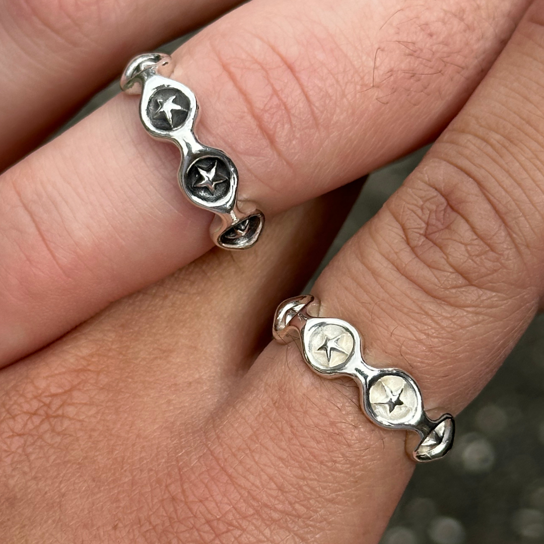 Our Caterpillar ring designs, at their thinnest point, can vary between 4mm and 6mm thick.